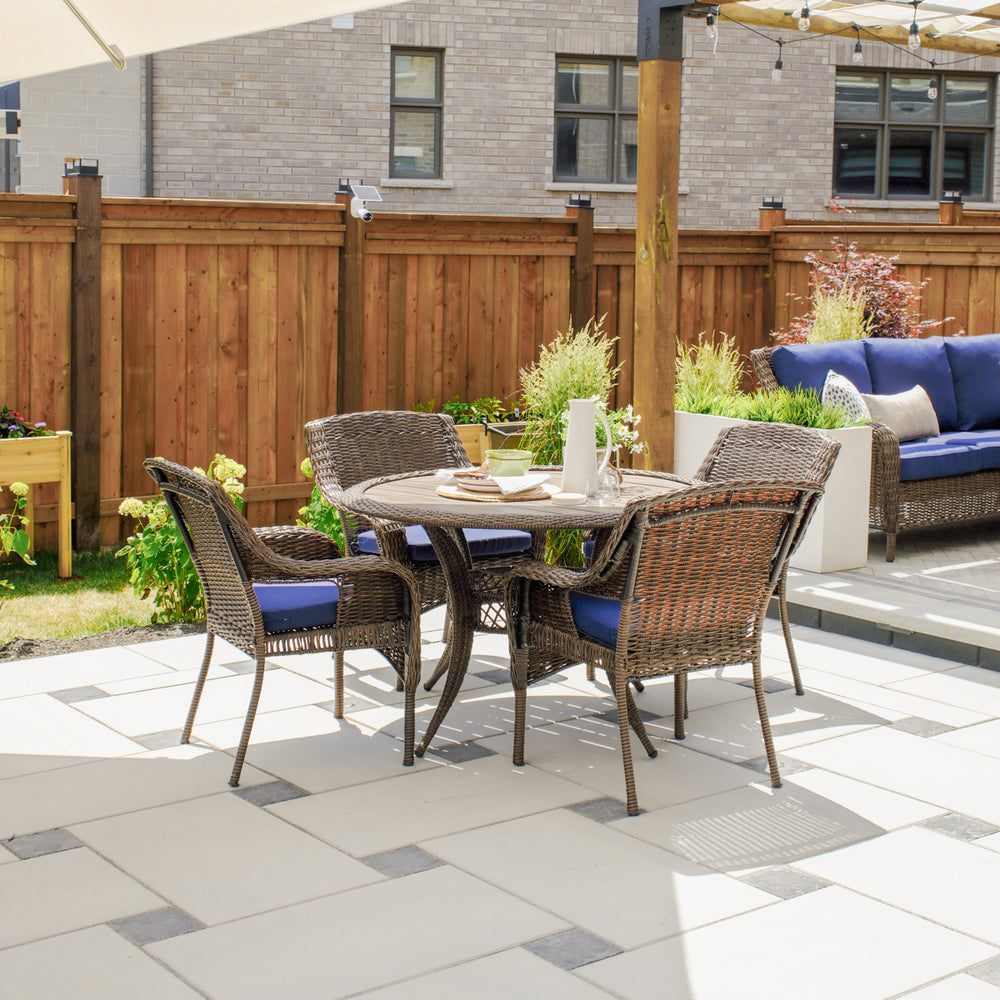 The Cambridge 5-Piece Dining Set is a hosting essential for your yard. Featuring four armed dining chairs and a finely woven round dining table. Add to that a built-in umbrella holster for sunny days and slatted tabletop to prevent water retention, dinner in the fresh air has never been easier.