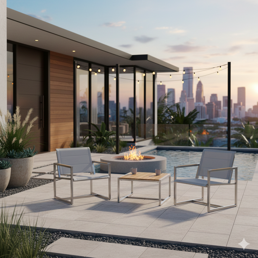 Acacia outdoor end table with sleek stainless steel frame and premium-grade teak wood top, showcasing a modern design.